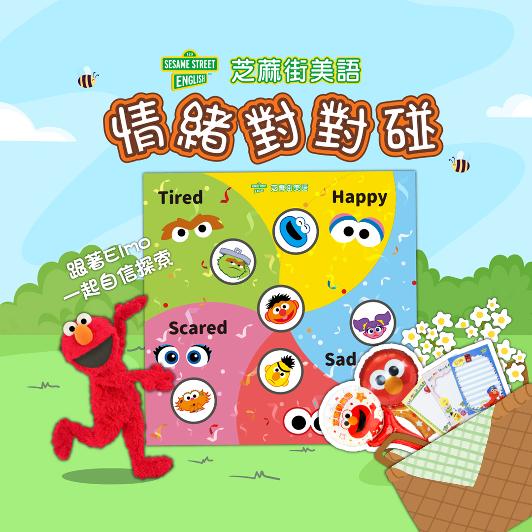 每天都有各種情緒陪伴我們,有時候開心快樂,有時候難過生氣,結合芝蔴街經典角色,帶領孩子們一起認識常見情緒英文單字。透過有趣的對對碰遊戲,讓小朋友將玩偶情緒卡,放到正確的對應位置如happy、sad、angry等,邊玩邊學,一起跟著Elmo探索情緒世界,勇敢面對、自信表達!